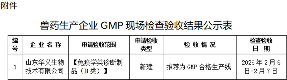 近日,山东华义生物技术有限公司(以下简称“华义生物”)正式通过兽药生产企业GMP验收,体现了华义生物在参与宠物医疗诊断市场竞争中的合法合规性,标志着华义生物在生产质量管理体系建设上迈出关键一步,为提供准确可靠的临床诊断结果奠定坚实基础,是华义生物在动物医疗领域战略布局中又一里程碑式的突破。